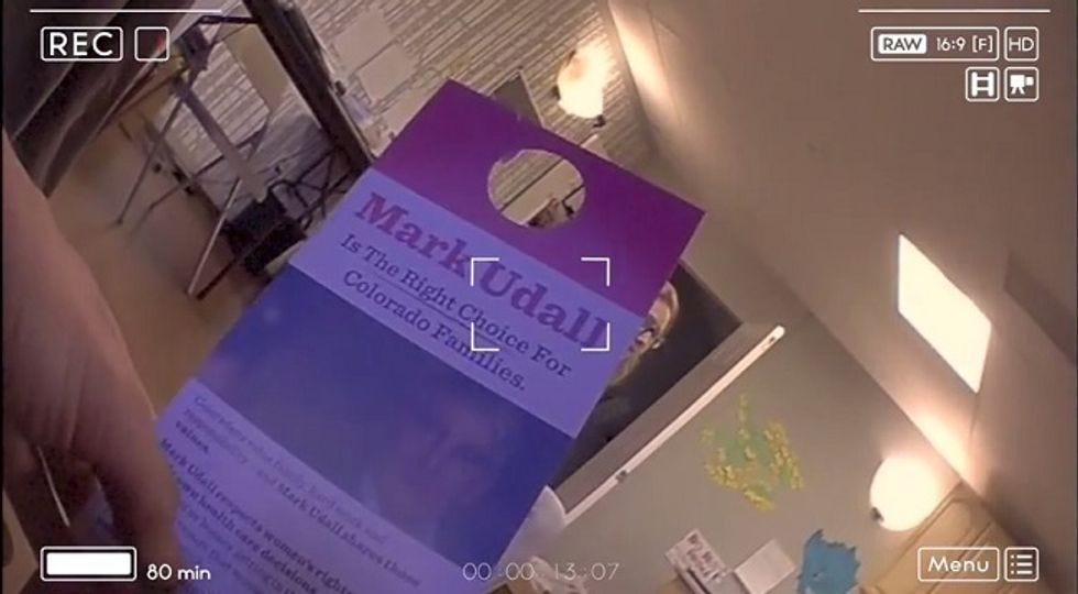 O'Keefe calls Work for Progress "a non-profit working hard to re-elect Colorado Democratic Sen. Mark Udall." Hey, that sounds almost like they represent the actual Colorado Democrats! In a five-second blink of the video, while Hicks isn't looking, O'Keefe flashes a glossy door hanger for Sen. Udall in front of the hidden camera. This is supposed to prove that the organization is illegally coordinating with Udall's campaign because O'Keefe "found" (or quite possibly "brought with him") the incriminating evidence of Udall campaign material. (Since O'Keefe got busted by another non-profit for trying to plant Udall campaign materials in their space as "evidence" of improper coordination with the campaign, we are somewhat doubtful.)