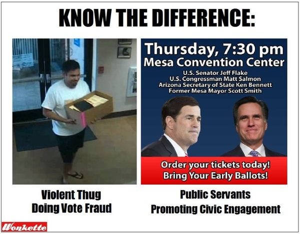 The piece acknowledges that Arizona law allows groups to turn in ballots, but goes on to allege -- with no evidence, of course -- that CBA and other groups go door-to-door collecting "virgin ballots" in exchange for "an item of value and a promise of political favorism," and then complete the ballots however they want. Sure, the verification of signatures on early ballot envelopes should make that impossible, but it's a great voter-fraud horror story: