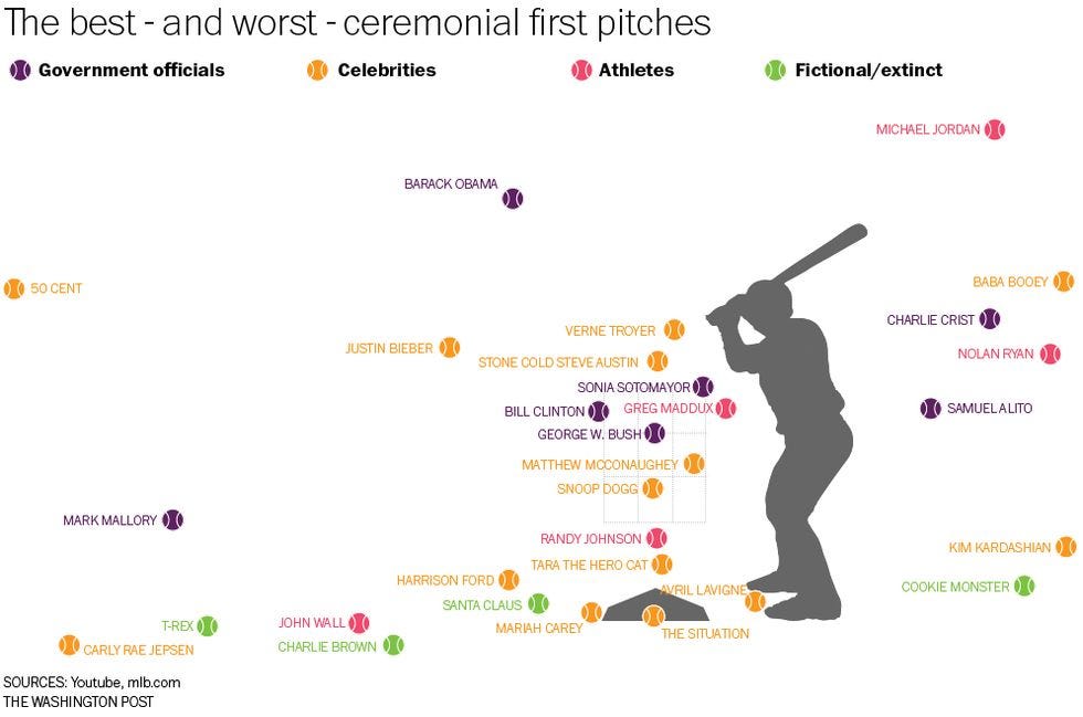 It's been one brain-basher of a week, and it's only Tuesday. So take a minute to watch this terrific little "Best New Thing in the World" clip about how ceremonial first pitches usually suck -- there's even a Washington Post chart to prove it: