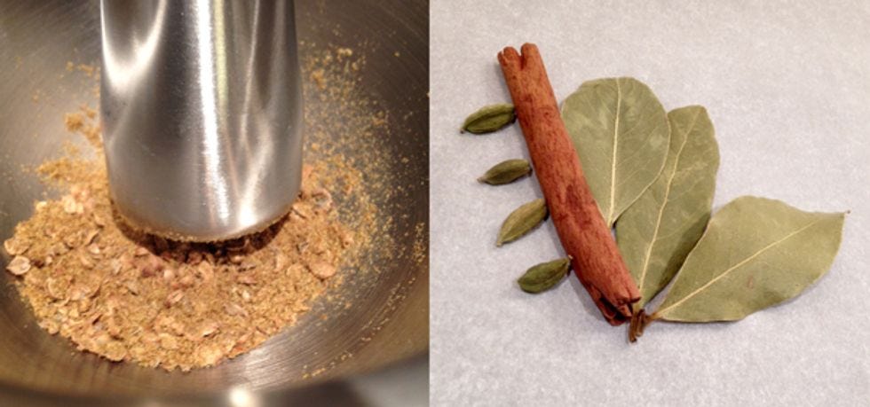 In a non-stick skillet on medium-high heat, toast the cumin and coriander for a few minutes, and avoid over-cooking. Shake the pan to turn the spices, to keep them from burning. Let this cool for about ten minutes, and then pulverize them with a mortar and pestle (or a spice grinder). Crushing things smells so freaking good.