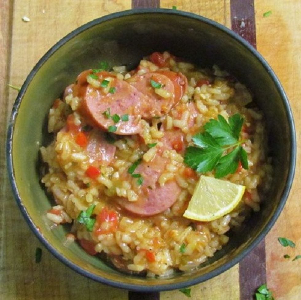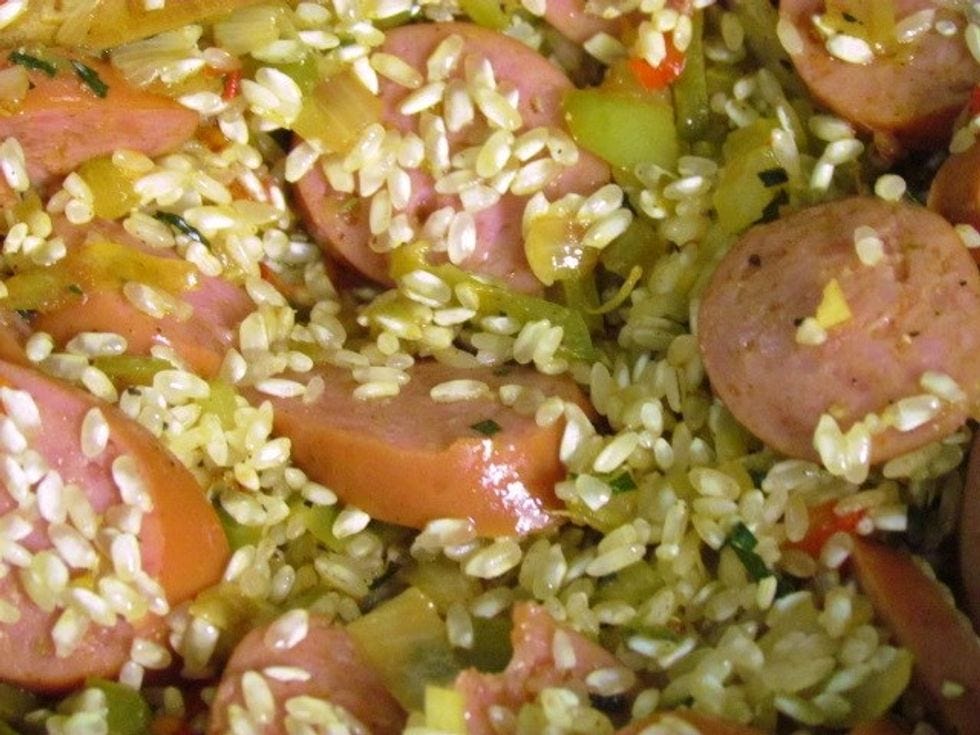 If you want pieces of chicken or other meat in lieu of or addition to the sausage, brown those in the pan before you do the vegetables, then add them back at the same time you add all the liquid. If you want to include shrimp, stir those in about 5-7 minutes before the rice should be done. If you have a little bit of wine in the bottom of a bottle from last night, use that to deglaze the pan before adding all the liquid. The possibilities are endless.