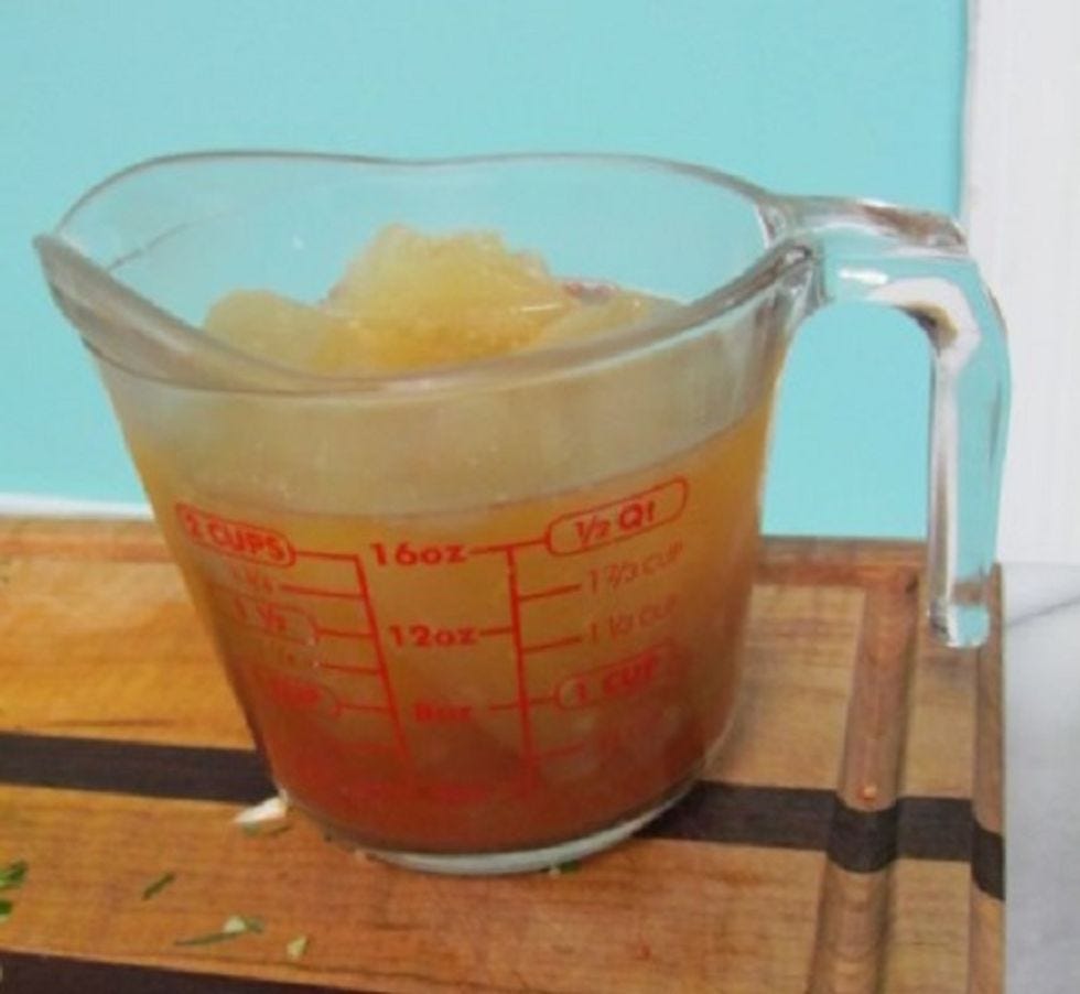 In your glass measuring cup that can hold at least 2 cups, put the frozen cubes of chicken stock, the juice from the can of tomatoes, and enough of the beer to top it off to 2 cups.
