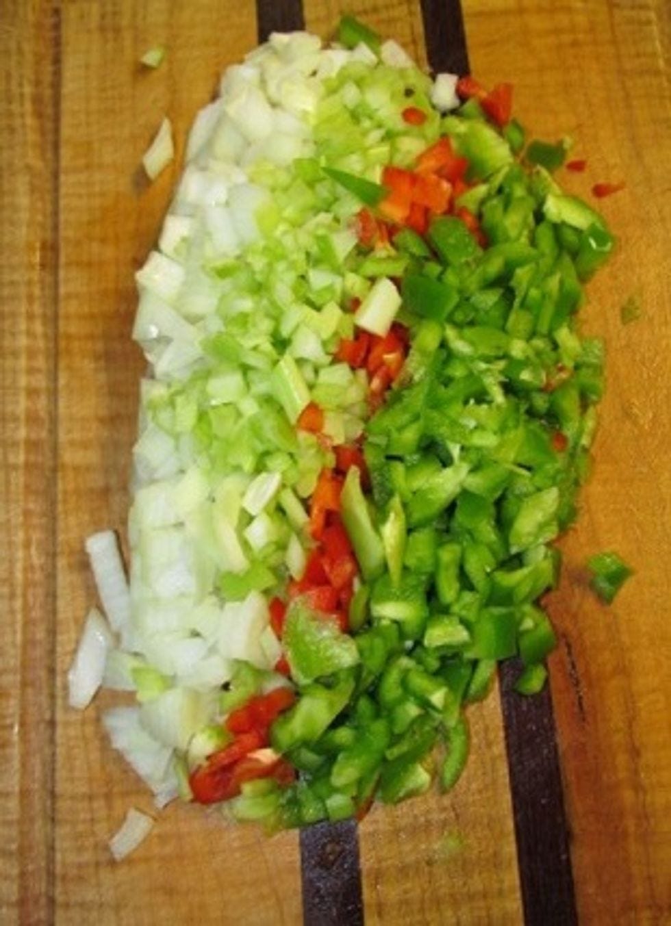 1/2 onion, 1 or 2 ribs of celery, 1/2 green bell pepper, 1/4 red bell pepper, all diced together