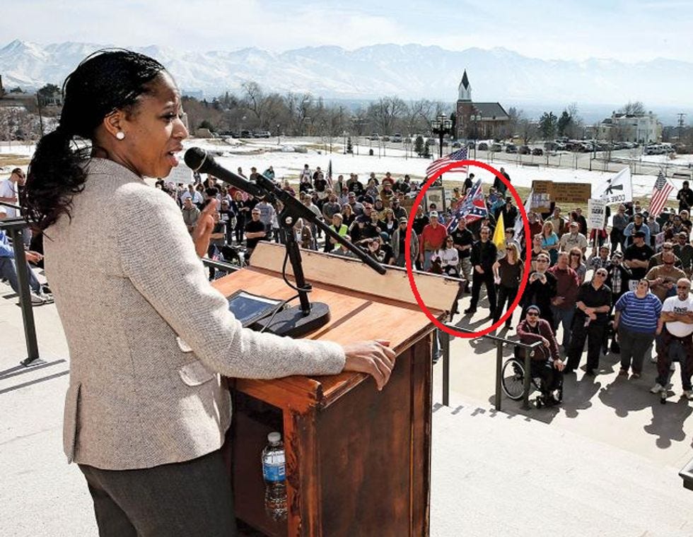 Finally, let's just close with this photo of Mia Love at a Second Amendment rally this spring, where a gentleman waving a Confederate flag helps us all understand that this is all about values and principles: