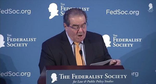 Unlike many of the conservative confabs we visit as political tourists, the Federalist Society does not have a bustling radio row with talk show hosts conducting interviews or a vendor room filled with right-wing documentary makers and shadow-campaign super PACs giving away tote bags and bottle openers slathered with their chosen messages. "FedSoc" is far too dignified for that! They prefer to stick to impassioned defense of the Constitution against all perceived threats, so we were looking forward to a fire-spitting opening volley from this year's first speaker, Supreme Court Justice Antonin Scalia.