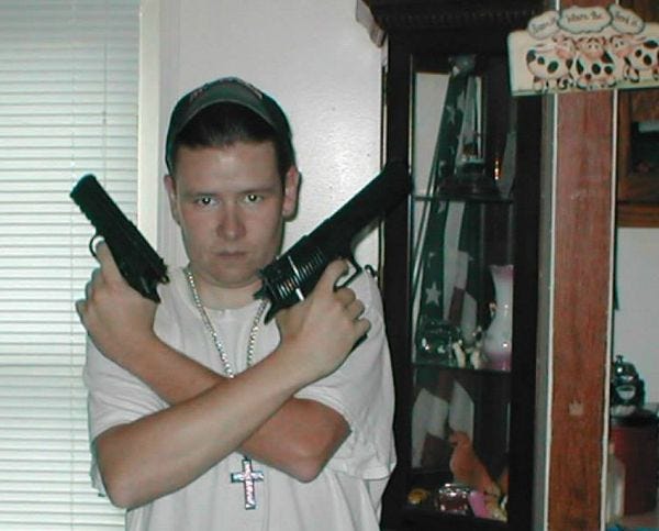 But really, isn't it about time you met Rob Kinnison, your new most despicable person of the hour, who legally owns several guns and loves to walk around with them in grocery stores such as Kroger because there's something or some things wrong with him? Ladies and gentlemen, here he is... some weird maniac named Rob Kinnison (for your protection, please turn down your speakers):