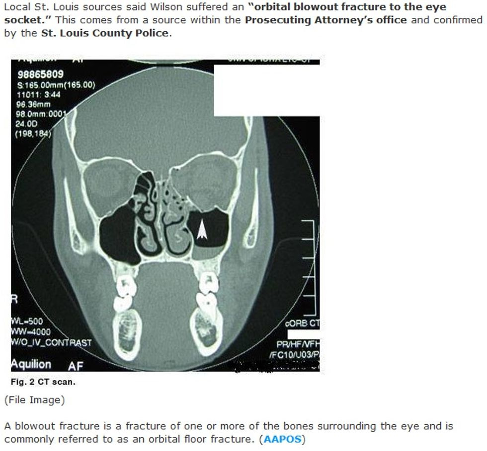 Remember how Stupidest Man on the Internet Jim Hoft got all kinds of press for "revealing" that Wilson had supposedly suffered a massive fracture of his eye socket? (Two sources told him!) Hoft was still linking to his own story of that massive injury as recently as this weekend. Here's Darren Wilson's face:
