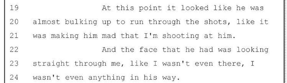 Finally, the moment that's so bizarre that we know that Darren Wilson isn't merely in a fight with a big strong black teen; he actually is going up against an X-Man with supernatural abilities. After Wilson chased Brown with a "cloud of dust behind him" -- which frankly is more Looney Tunes than Marvel Comics -- Brown turned and began moving toward Wilson again, maybe reaching under his shirt for his waistband (gotta throw that in for good measure). Wilson fired his gun at Brown, hitting him at least once, but the bullets just made Brown angrier. And here's where we get first-hand testimony of Mike Brown's superhuman abilities. Somehow, copying the text isn't quite sufficient; you need a screenshot of the transcript to appreciate it: