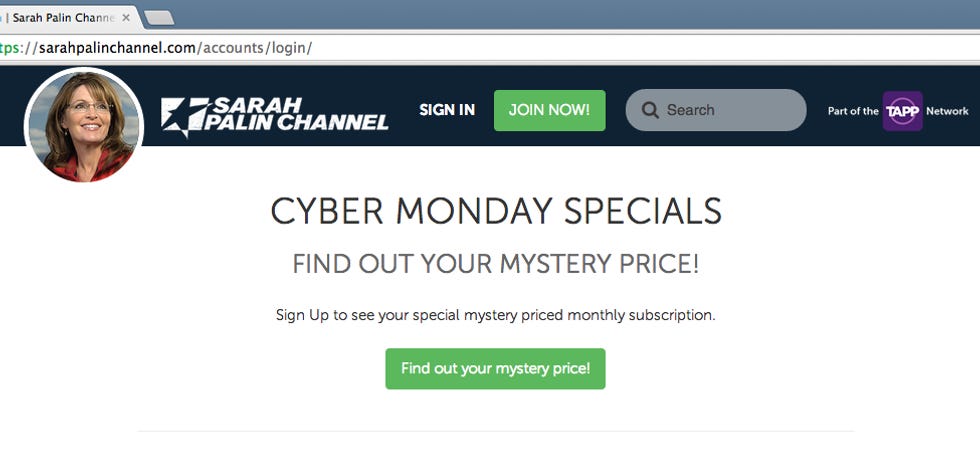 Governor Quitterface is in on the Cyber Monday action ahead of schedule. If you go to the Sarah Palin Channel right now (no link, because seriously?) you may find this message, teasing a personalized "mystery price" for new subscribers.