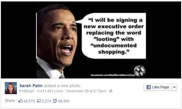 After having said pretty much nothing about the shooting of Michael Brown in Ferguson, Missouri, occasional reality television show front-woman Sarah Palin finally shared her thoughts with America over the weekend by reposting to her MyFacePlace page a joke from rightwing conspiracy website Mad World News.