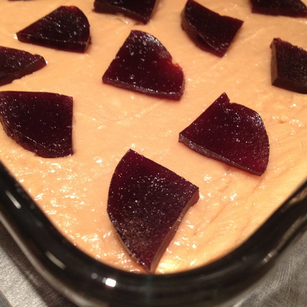 It looked like it needed something on top, so I opened a failed red grape jelly that I botched over the summer. Failed jelly is too stiff for sandwiches but it goes well with roasted pork so I kept it. For our fudge-related mission, I chopped up a few sliced of the red grape jelly and dotted the top of the pan. PB & J, right? I know. The pan rested in the fridge for about four hours.