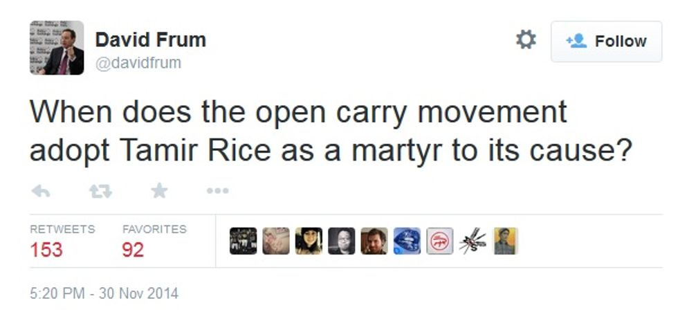 From the replies to that tweet, we learned why the deaths of Tamir Rice and John Crawford (who was shot dead as he carried a toy replica of an AR-15 around a Wal-Mart) don't have anything to do with Open Carry. They just don't, OK? We've been looking around the interwebs, and we're just not finding a lot of support for Tamir Rice among the gun-fondling set. In fact, just about the only thing we've seen has been people asking, like David Frum did the other day, why the Open Carry bunch just doesn't have a lot to say about the execution of a child pretending to exercise his Second Amendment rights.