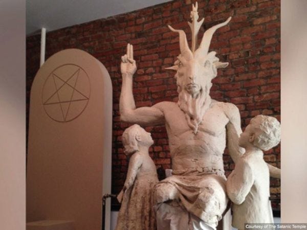 The Satanic Temple is also continuing its effort to balance the Oklahoma State Capitol building's Ten Commandments display by erecting a 2-meter statue of Baphomet singing Rockabye Sweet Baby James to adorable little children: