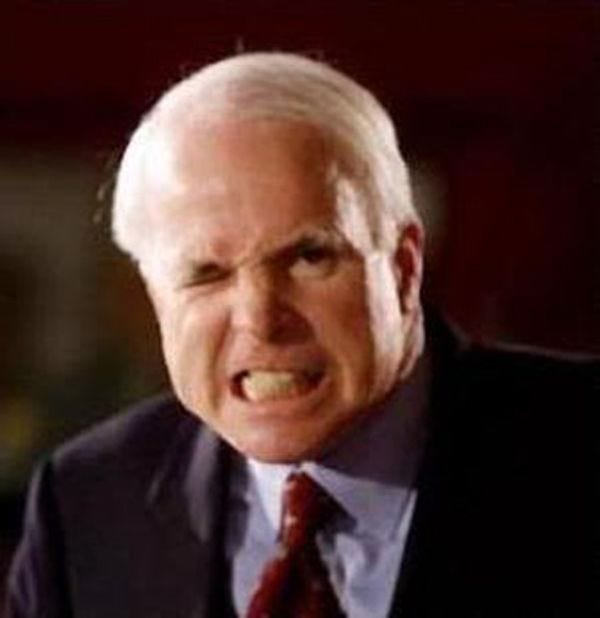 Somewhere out there, there are going to be some very butthurt patriots seething at McCain for desecrating the sacred E Plebnista by suggesting that even Bad Muslim Terrorists have the right to be treated as if they were humans.
