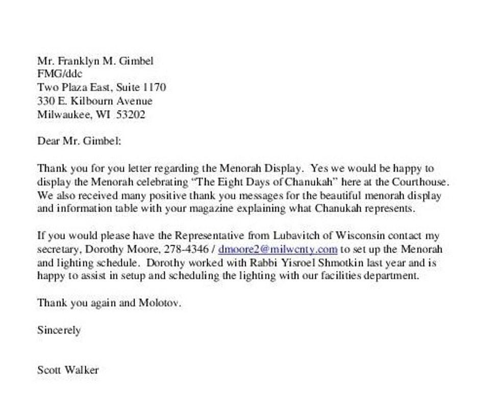 Walker told Gimbel his office would be happy to display a menorah celebrating "The Eight Days of Chanukah" at the Milwaukee County Courthouse, and asked Gimbel to have a representative from Lubavitch of Wisconsin contact Walker's secretary, Dorothy Moore, to set it up.