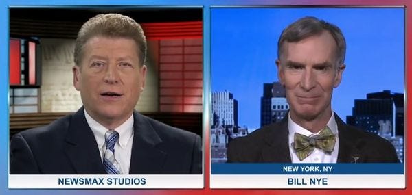Rejecting every effort by Newsmax host Smiley McFalse-Equivalence (known to some as Ed Berliner) to suggest that maybe there's a happy middle ground between science and an insistence that every word of the Book of Genesis is literally true, Nye pointed out that when adults lie about science to children, it harms their prospects for actually living in today's modern world of today: