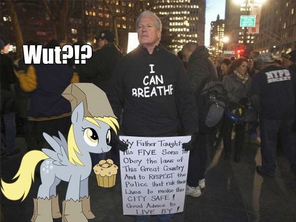 Our Top Derp goes to the clever people who came up with these hilarious "I Can Breathe" sweatshirts for a pro-police rally in New York City Friday. Get it? Get it? If you simply never break any laws ever, and always comply with cops' lawful orders, you will never be strangled or shot, and you can therefore breathe. Of course, it also helps if the cop is a lousy shot once he decides that you look too dangerous while you reach for the ID he just demanded. If you're really lucky, the bullet will only graze a lung. And there you are, still breathing, probably.