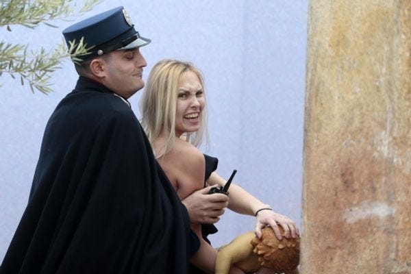 So this happened. On Christmas Day, after Pope Francis sang a rousing round of "Happy Birthday, Jesus" from his special balcony on St. Peter's Basilica, a lady who'd forgotten to put on a shirt that day bum-rushed the crowd of people who'd gathered for the party to steal the little plastic Jesus from the nativity scene, with the words "God is woman" inked on her chest. The woman is a member of FEMEN, a super-radical-even-for-us-radical-feminists feminist group who, as far as we can tell, is taking down the patriarchy by being topless in public. We're not sure how that works exactly, but the woman who stole baby Jesus was apparently carrying out the group's "Massacre of the Innocents" campaign :