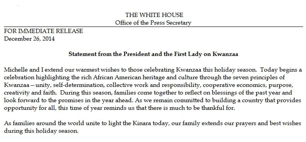 Barack and Obama Michelle Obama have released their Annual Perfunctory Message for Kwanzaa:
