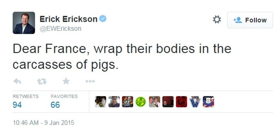 Erickson followed this up with a quickie post about the inevitable reaction to his little witticism, explaining that you can't have it both ways: A lot of people in the media -- delusional people, obviously -- have claimed that the radicals who perpetrated the Charlie Hebdo massacre don't reflect mainstream Islam, or that they