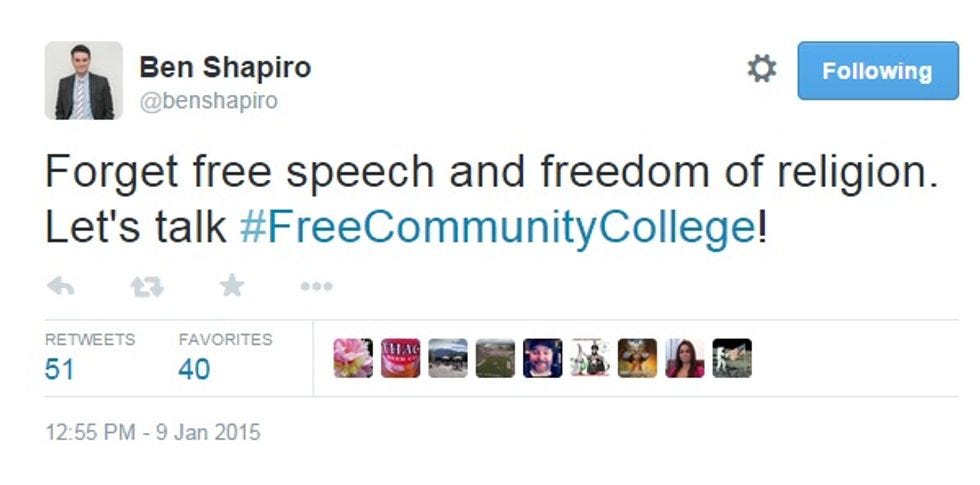 Also, adds Shapiro, Obama is a jerk for talking about community college when Freedom is at risk: