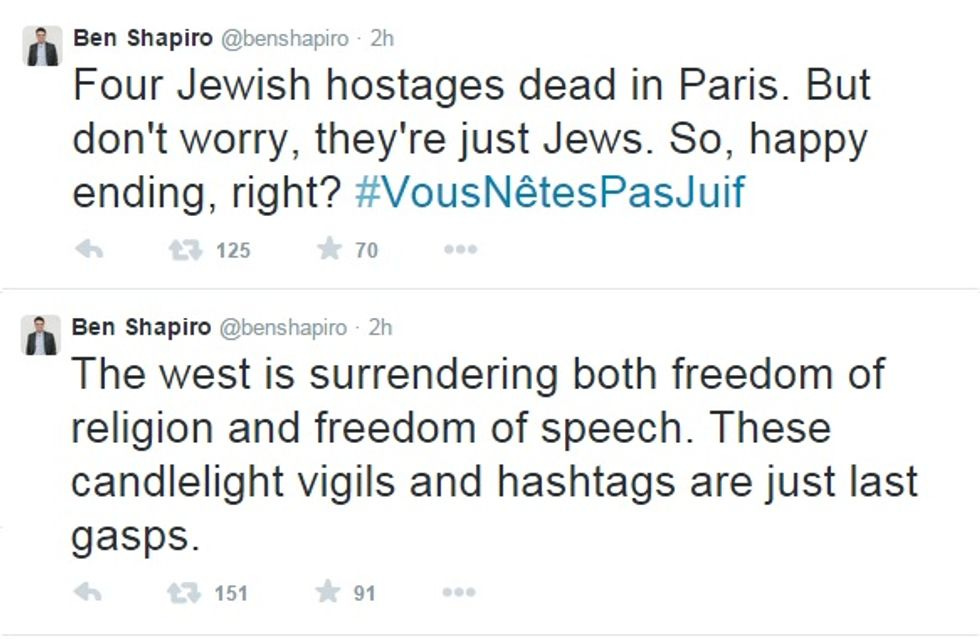 Shapiro is also pretty pissed that anyone is worried about anti-Muslim backlash, because did you know that the terrorists were Muslims? And also they targeted Jews? And Islam hates Israel, and it is apparently impossible to oppose both anti-Semitism and irrational hatred of Muslims.