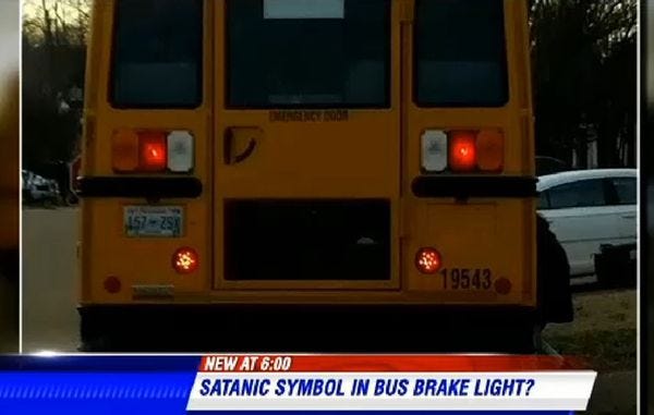 From Memphis, Tennessee, we have this important news of demon-possessed bus tail lights, thanks to easily upset Christian lady Robin Wilkins, who saw a star pattern in the LED taillights of a school bus. She decided it was a Satanic pentagram just like on a heavy metal record, and took her concerns to the local teevee station. Which aired them, of course, because why wouldn't they?