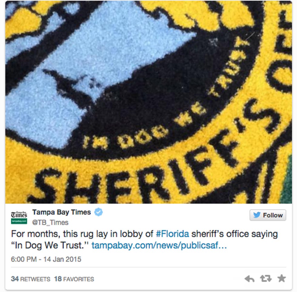 "bright-green rug with the sheriff’s official seal, which includes an outline of Florida and the motto: 'IN DOG WE TRUST'"