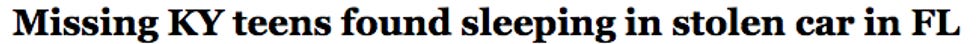 Dalton Hayes, an 18-year-old out on bond from a burglary charge, and Cheyenne Philips, his 13-year-old "girlfriend," ran away from their respective homes in Kentucky and stole a series of cars around the South before being arrested two weeks later. It's a simple enough story: star-crossed lovers go on multistate crime spree! We're rooting for ya, white kids! Here's the headline from the Associated Press, as published in the Los Angeles Times: