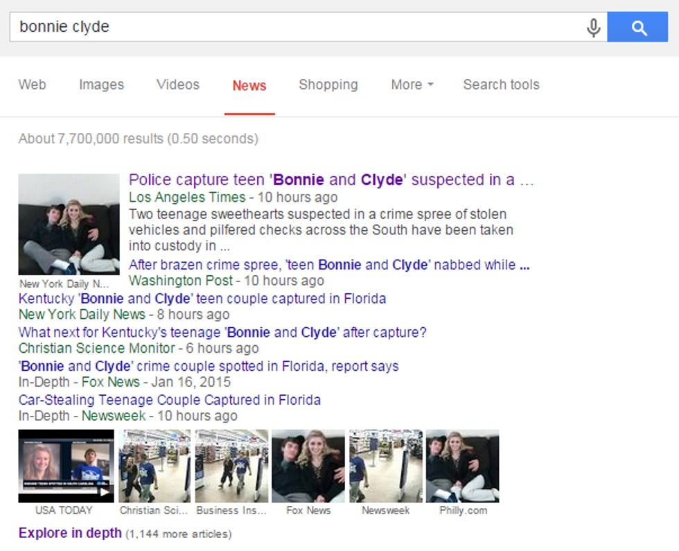 We did not cherry-pick this headline. "Bonnie and Clyde" was the dominant description used for "Hayes and Phillips," as evidenced by this snapshot from Google News: