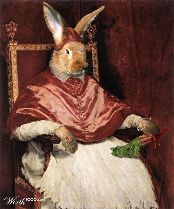 Pope Francis is doing that thing again where he halfway sounds like a liberal socialist weenie and then turns around and throws a bone to the patriarchal jerkface constituency. For instance, on his way back from the Philippines, he said today that Catholics don't have to "be like rabbits" and bring forth a litter of young every few months, but he also emphasized that he was not condoning contraception, but rather "natural family planning," aka the rhythm method, aka the get pregnant and thank the Virgin for anotherdamn mouth to feedblessed little angel method: