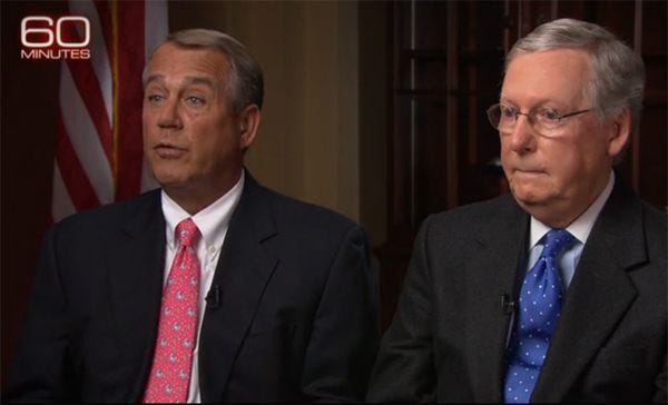 Senate Majority Leader Mitch McConnnell and Speaker of the House John Boehner went on the 60 Minute televisual informatical program Sunday to explain all the exciting plans the Republicans have for uprooting Obamacare and replacing it with something much better, except that the part where they actually said what the replacement would be kind of got left out. Asked to explain the GOP's Obamacare alternative, Boehner offered a clear-eyed vision of the past and how things might have been different, maybe: