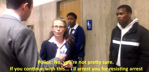 Our Armed Public Servant, when asked to account for his unexplained and unaccounted behavior, provides no explanation or account. Instead, he offers a tough guy cop impression that's like My Little Pony meets the Shield and decides to mix downers with vodka. It's his fallback when he realizes he doesn't know what laws afford him the right to photograph these men, and feels himself simply above even providing an explanation to a lowly civilian, even if she is a public defender representing her client. Everyone there knows that he doesn't know what he's talking about. The other public defender filming the interaction does. The other police carefully maintaining poker faces do. Tillotson does too, which is why she smiles confidently as she politely refuses to budge.
