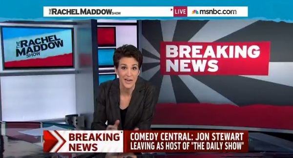 And with their usual logic, the MSNBC web hobbits have split Rachel's "A" segment into three videos, with the Stewart announcement and interviews with New York Times media guy David Carr and New York Magazine's Chris Smith posted as separate videos: