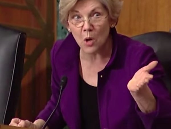 Sen. Elizabeth Warren has been so busy yelling, in her polite schoolmarm voice, of course, at ALL the bad guys -- Big Pharma and anti-vaxxers and her Senate colleagues on the other side of the aisle who think they work for Citibank (they do not) -- that it's nice to see her get back to her roots of yelling at those som'bitch banker types who tried to bankrupt America.