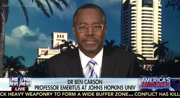 Carson appeared on Fox News, the official home for wingnuts who might run for president but will never win, to explain why we have not destroyed ISIS and all our enemies yet. It is because of Obama, in case you didn't see that coming, and how he is a terrible leader who does not understand how ISIS is the worst enemy we have ever faced since the last worst enemy we had ever faced, which dumb Obama does not understand.