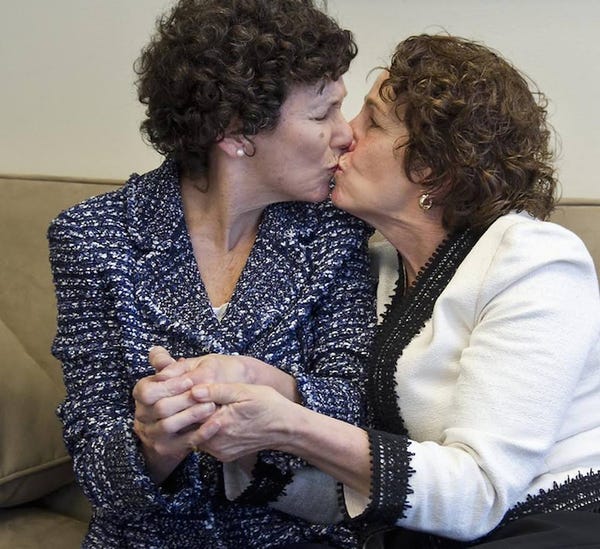 And guess what? That day came 48 hours later! Sarah Goodfriend and Suzanne Bryant wanted to get married (and quickly, because Goodfriend has ovarian cancer), so their lawyer was like, hey, DeBeauvoir's on our side, let's sue in state district court to force her to be able to issue the license. District Judge David Wahlberg basically said "hell yes, let's do this." He wrote: