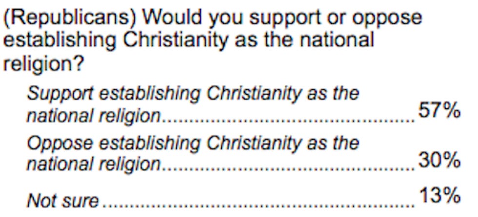 Neat! The party that's always harumphing about THE FIRST AMENDMENT!!! and RELIGIOUS LIBERTY!!! has never read the First Amendment, which is a real surprise to anyone who's been trapped under something heavy for the last few years. And if you look at the crosstabs -- that's nerd talk for "details" -- it turns out the majority of the majority of Republicans who want to officially rename the country the United States of Jesus are women, so good for you, GOP ladies, your reading comprehension is especially impressive.