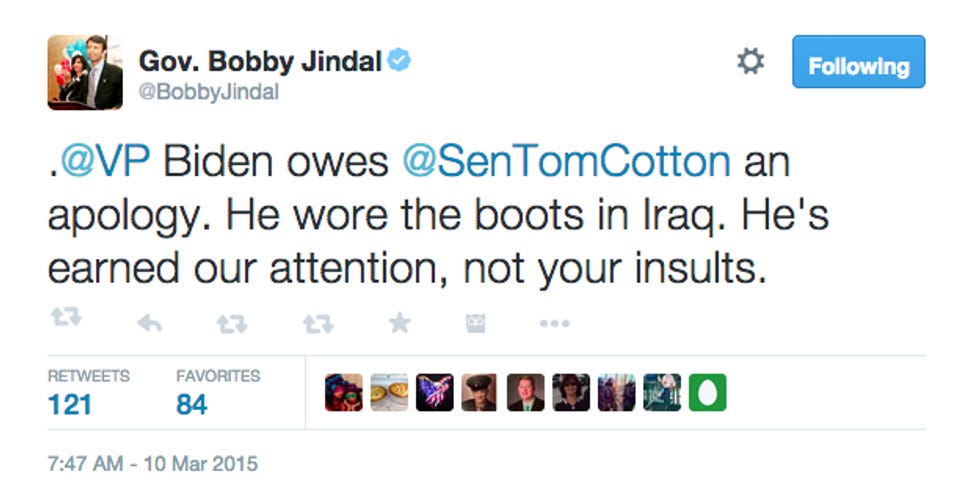 Jindal, though, who wants the world to know he IS the Honorary 48th Traitor in the Senate, has PLENTY of thoughts to share. Including that Troops-Hatin' Vice President Joe Biden owes actual America-traitoring Tom Cotton an apology. What, you don't believe it? Neither do we, and yet: