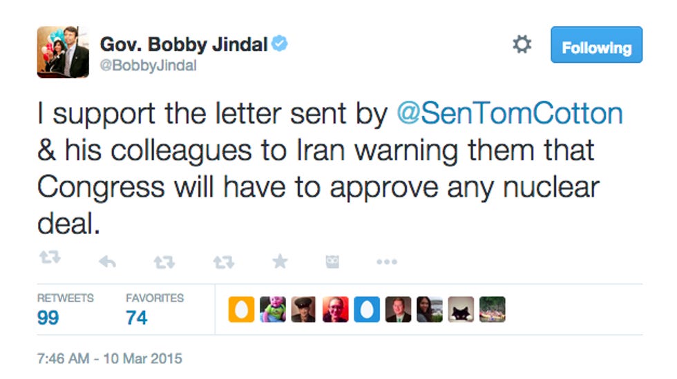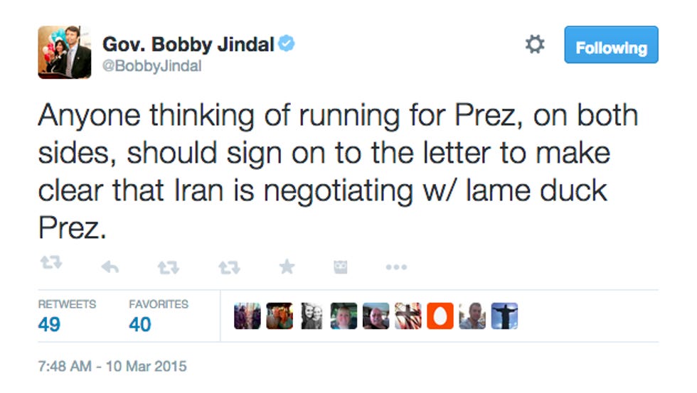 Jindal is so eager to "me too!" with the other cool kids, though, that he is "officially" adding his name to the letter on Tuesday, even though he is not actually a United States senator. Meanwhile, his potential 2016 primary rivals Ted Cruz, Marco Rubio, Rand Paul, and Lindsey Graham -- all of whomdidsign the letter -- have been suspiciously silent ever since. Maybe because they're busy consulting with their advisers about how to get out of looking like a bunch of goddamned traitors to U.S. America?