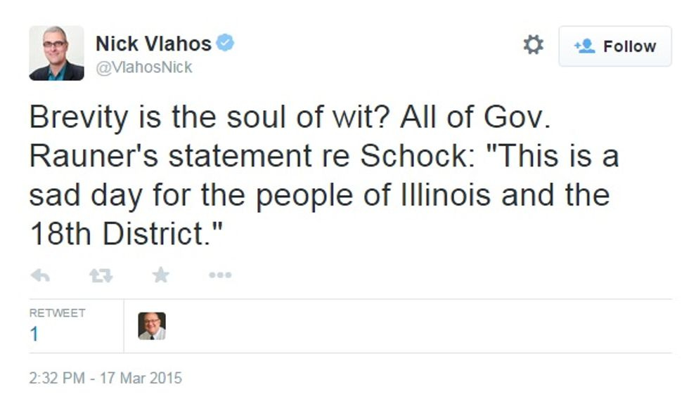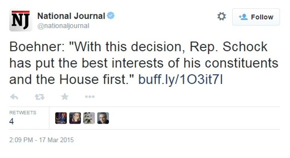 You may have heard that Rep. Aaron Schock has suddenly resigned in the aftermath of the astonishing revelations in the final episode of HBO's The Jinx. And has the unexpected departure of the Distinguished Gentleman From Instagram blown up a Tweetstorm? Has it ever! There are the de rigeur solemn statements of regret, of course: