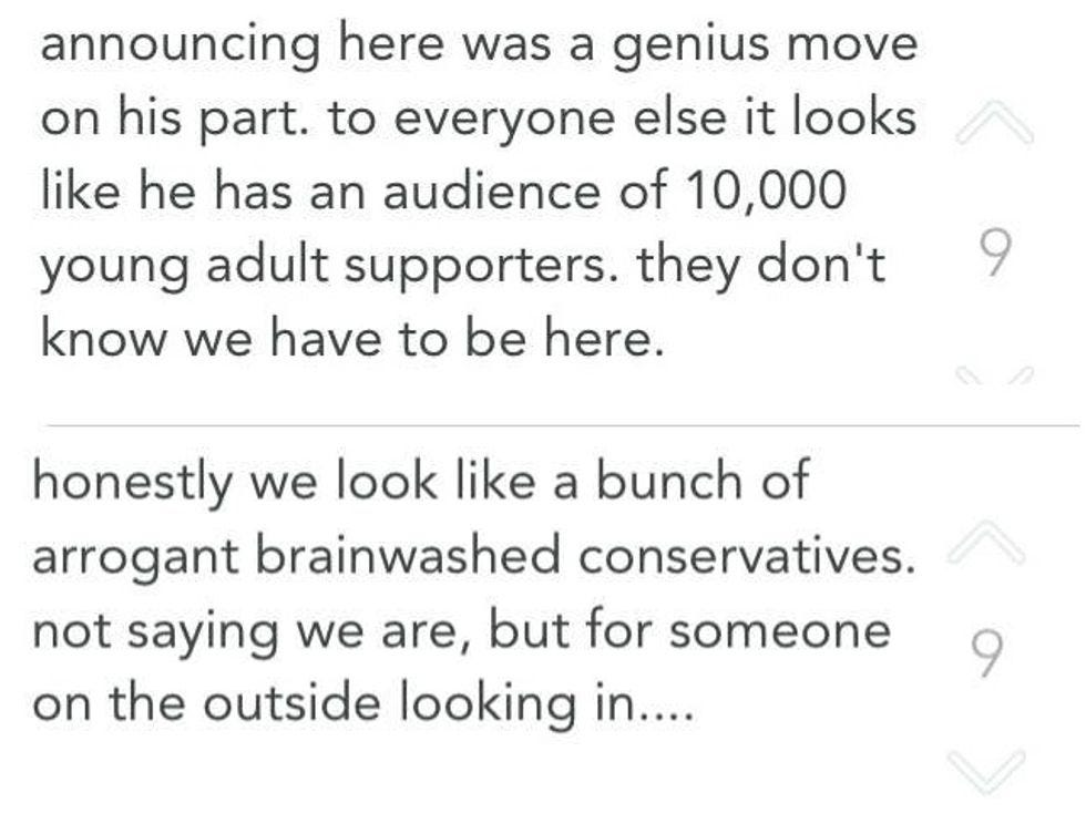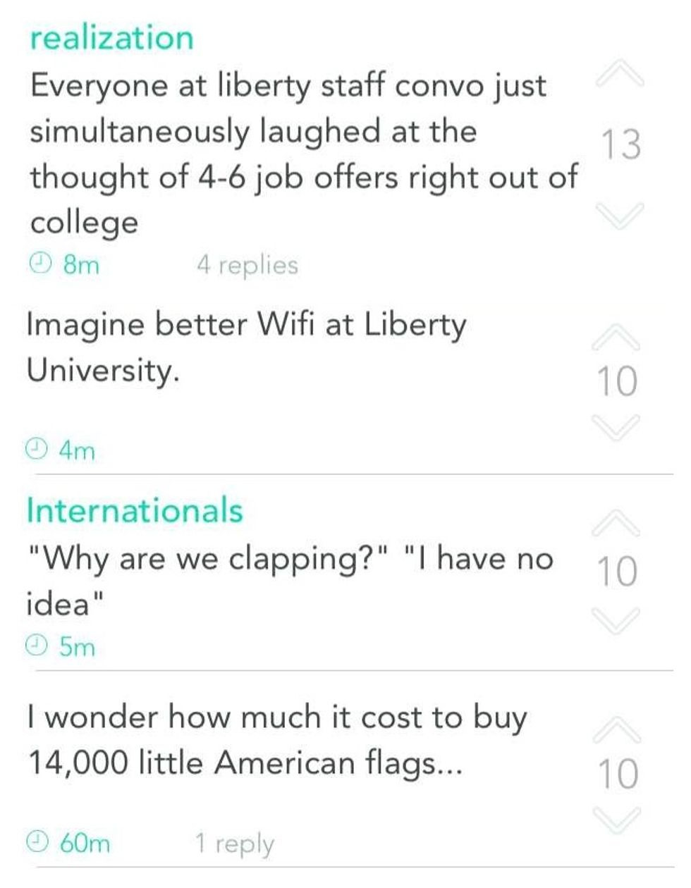 Not all the students in the Liberty University crowd were delighted with the event, because apparently even Born Again Christian college students like griping on social media, bless their hearts. A few choice comments from the anonymous Yik Yak app (what? Liberty students not revealing their identity while using their phones at a mandatory event? ):