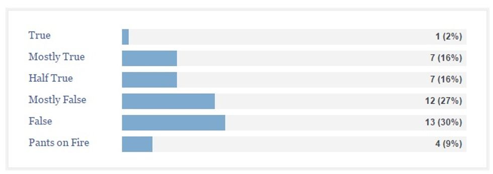 David Bossie, the head of Citizens United (sounds familiar for some reason) is pretty chuffed about the announcement, telling Newsmax that Ted Cruz "speaks truth to power." Presumably this means that he lies to the head of NASAabout what the space agency's mission is, promises to "repeal" Common Core, even though it isn't actually a law, and is generally full of shit. (Also, when did the right wing decide to adopt the phrase "speaking truth to power," which we're pretty sure is trademarked by Radical Ethnic Studies professors, and our benevolent Editrix's mom, in the first place?) Fun fact: Of 42 Cruz statements checked by Politifact -- and yes, we know Politifact is far from perfect -- only one received an unambiguous rating of "true." Truth to power? The guy has trouble speaking truth to anyone.