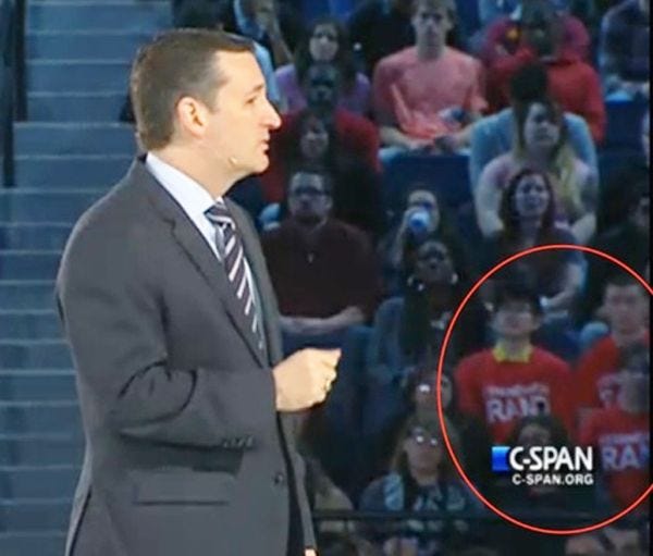 Ted Cruz is ready to take America down the Jesus Road to national salvation, and some people are more excited about that than others. On the one hand, you have your Tea Party Nation, which declares Cruz "the only electable Republican" because he's very smart and is "not handcuffed with the consultant class" that has kept Real Conservatives from winning the GOP nomination, and hence the presidency. And then there are fans of other candidates, like the Liberty University students in the photoabove, who wore their "Stand With Rand" t-shirts for Rand Paul and made a point of sitting in the front row.
