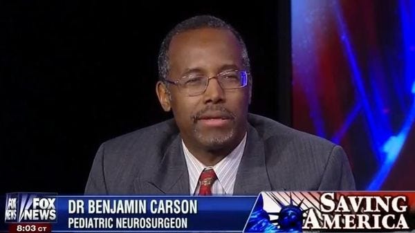 Not that the GQ piece is all hits on Carson being a boob who's completely out of his depth -- though those are the fun parts, yes. Zengerle looks at Carson's up-from-poverty backstory, and his genuine brilliance as a neurosurgeon as well. Thing Yr Wonkette didn't know, for instance: In 1987 Carson performed the first successful operations to separate conjoined twins who were joined at the head; both babies survived. And Zengerle gives due attention to the prominence of Carson's success story in the African-American community, where for years he was held up as an inspiring example of a poor kid from Detroit who made good: