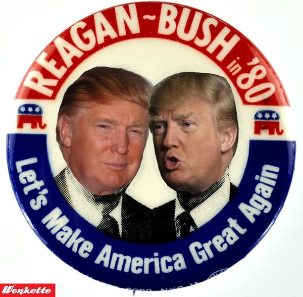 But as Matt Taibbi points out at Rolling Stone, Ted Cruz isn't the only thief to steal Trump's line. Ronald Reagan stole it from Trump 35 years ago, with a TV ad and posters and campaign buttons. And did Ronald Reagan thank Trump? No! Some Republican hero Reagan retroactively turned out to be!