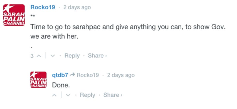 The Sarah Palin Channel commenter "qtdb7" is Yr Wonket's favorite. Disqus says that "qtdb7" has published nearly 1,900 comments, and as far as Yr Wonket can tell, they're all on the Sarah Palin Channel. Yet we are not sure that "qtdb7" is a plant! We cannot discount the possibility that "qtdb7" is just an older gentleman who happens to be in love with Sarah Palin.