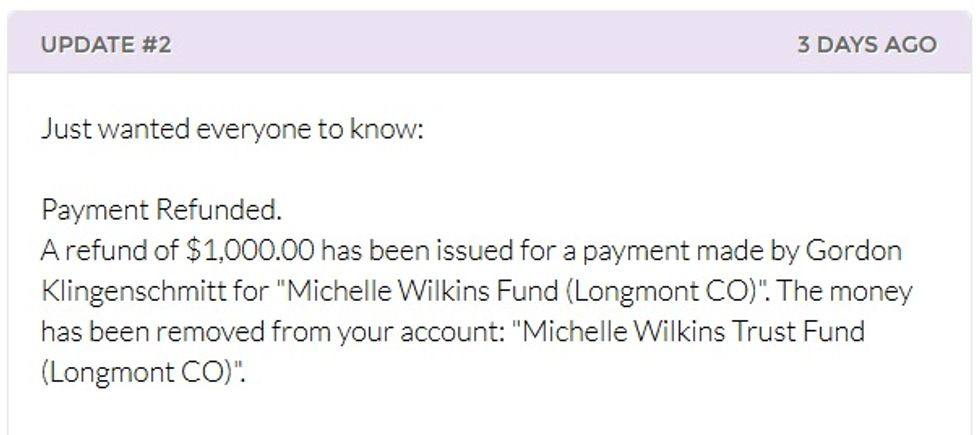 And the family of Michelle Wilkins has pointedly refused to accept a donation Klingenschmitt attempted to make to Ms. Wilkins's GoFundMe campaign: