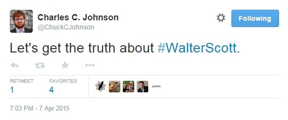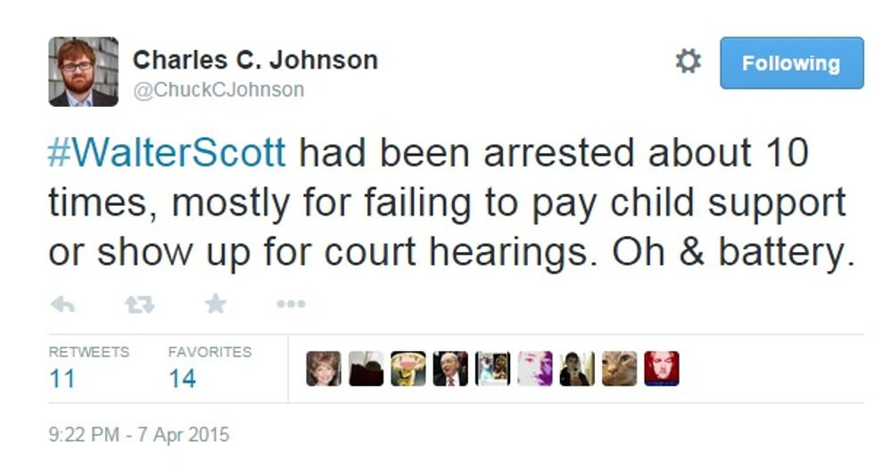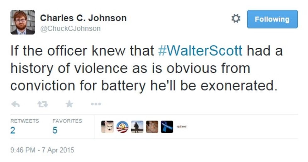 So far, there hasn't yet been much of an attempt from the Usual Media Suspects to turn Slager into the victim and Scott into a criminal thug who needed to be put down, although New Stupidest Man on the Internet and Award-Winning Journalist Chuck C. Johnson was doing everything he could to find a justification for Scott's murder, noting Scott's extensive criminal past: