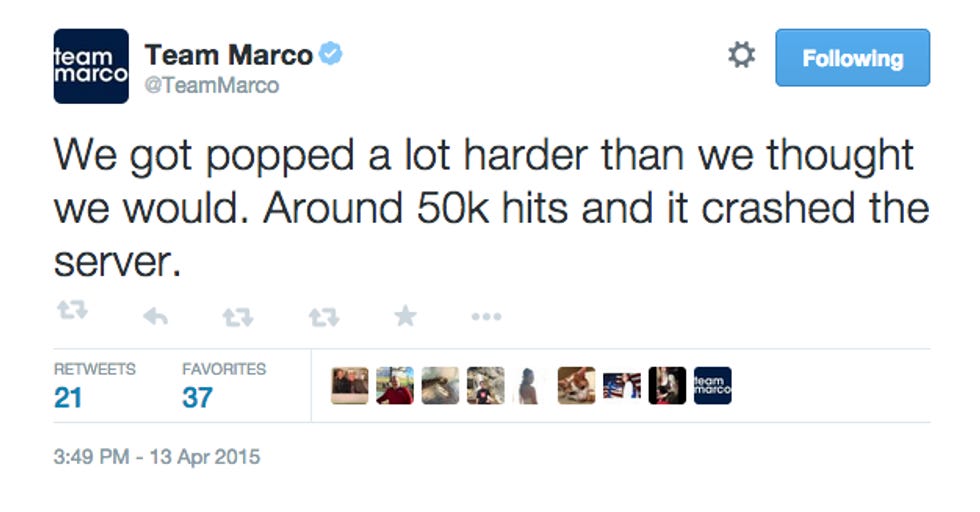 You know whose website was fully operational when her creaky old presidential campaign officially launched, even though she is SO YESTERDAY? That's right, Grandma Clinton. Perhaps Rubio should have asked to borrow her secret basement server.